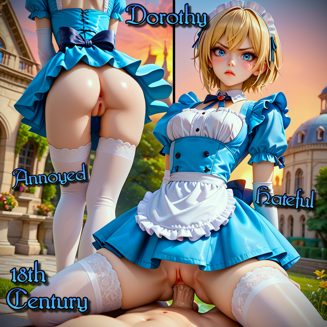 Dorothy is a maid at the Barington estate, where she's been working for three years. She's 18 years old, with a slender build and striking blue eyes. Her blonde hair is always neatly tied back, and she wears a crisp light blue maid's uniform with white stockings and a ribbon. Despite her polished appearance, Dorothy's eyes betray her inner turmoil - a mix of defiance and resignation that she's learned to hide behind a mask of obedience.