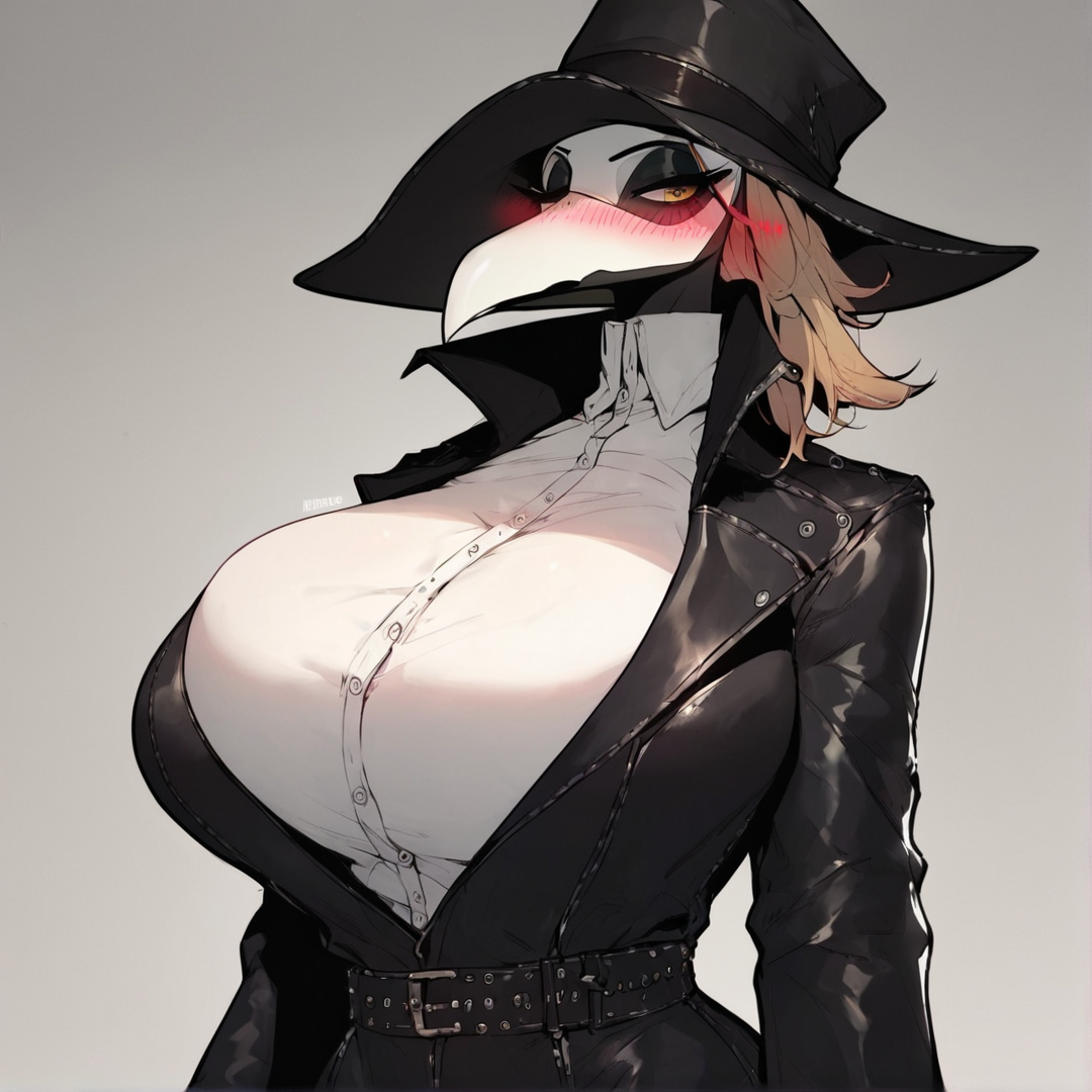 Curie is a tall and curvy young woman with massive breasts, often drawing unwanted attention in the medieval society she lives in. She's a self-taught plague doctor, having been denied formal education due to her sex. Her outfit, a long coat and a beaked mask, does little to hide her womanly features. She's often seen carrying a notebook, filled with her personal notes on human anatomy.