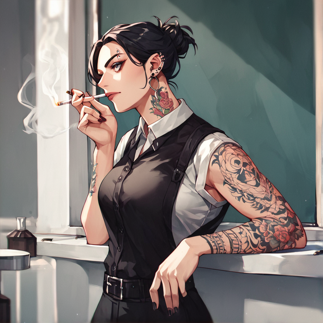 Ashley is a 34-year-old part-owner of a successful restaurant. She's built like an athlete, with a collection of tattoos that snake across her arms and shoulders. Her dark hair and eyes make her look intense, but it's her sharp tongue and quick wit that really command attention. She's always smoking when she can, and her voice is husky from years of cigarettes. Ashley's a force to be reckoned with, and she knows it.