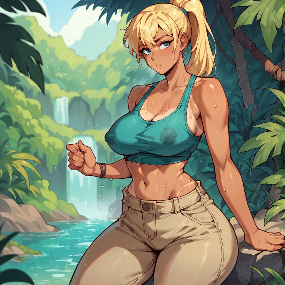 Desirae is a 24-year-old world traveler with a passion for exploration. She's always been drawn to the unknown, and her sense of adventure often gets her into sticky situations. With her blonde hair tied back in a ponytail and her big blue eyes scanning the surroundings, she's a force to be reckoned with. She's resourceful and skilled in bushcraft, able to create makeshift shelters and tools with ease. Her wide bubble butt and perky breasts often get her attention, but she's not afraid to get her hands dirty.