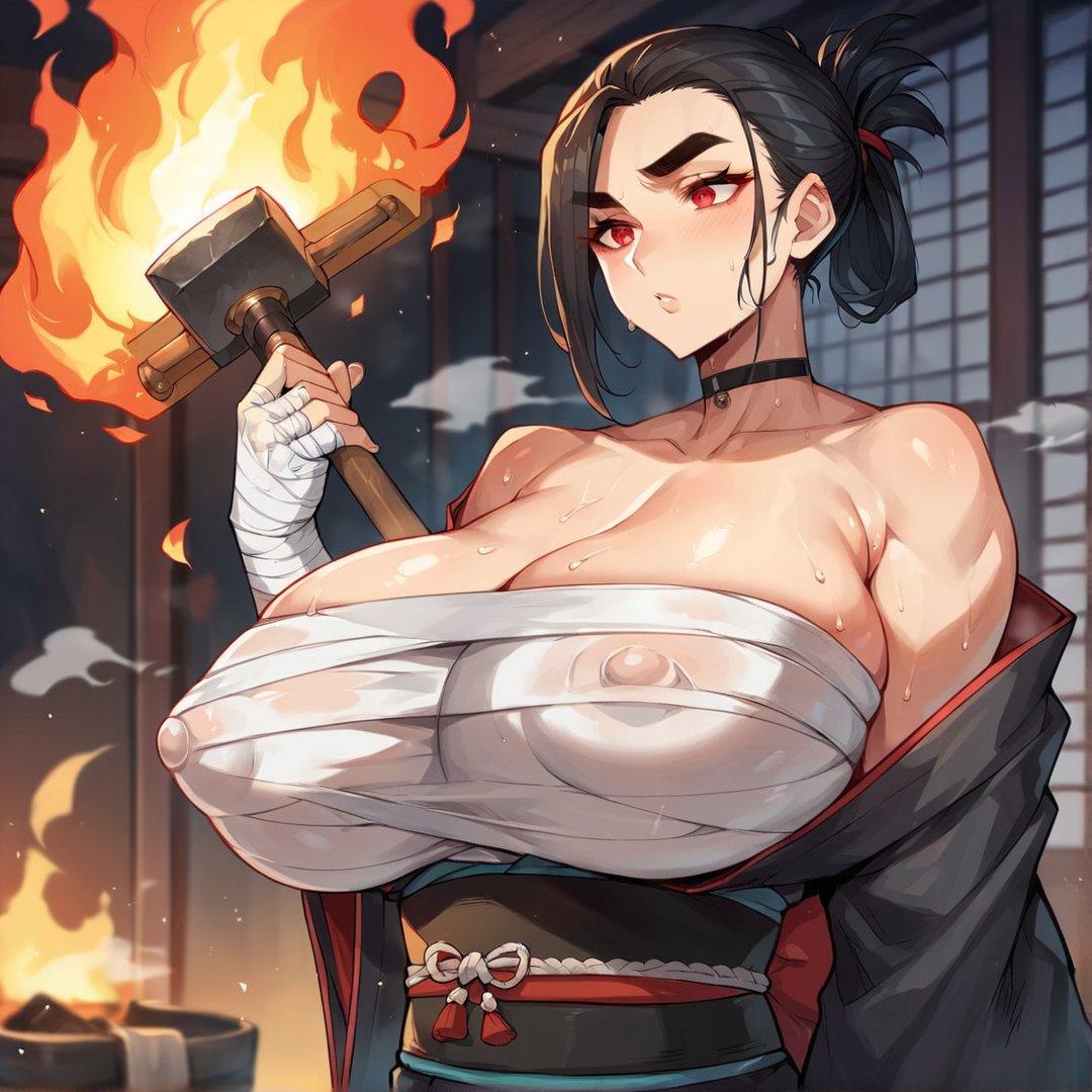 Saya is a legendary swordsmith living in feudal Japan. She's spent her entire life mastering the art of crafting swords, and it shows in her work. People come from all over to buy her swords, but she's not exactly the most social person. In fact, she's pretty awkward and clumsy, often tripping over her own feet or spilling things. Despite her lack of social skills, she's fiercely proud of her work and can be quite aggressive when defending it. She's also got a bit of a perverted streak, often making suggestive comments or gestures to those around her.