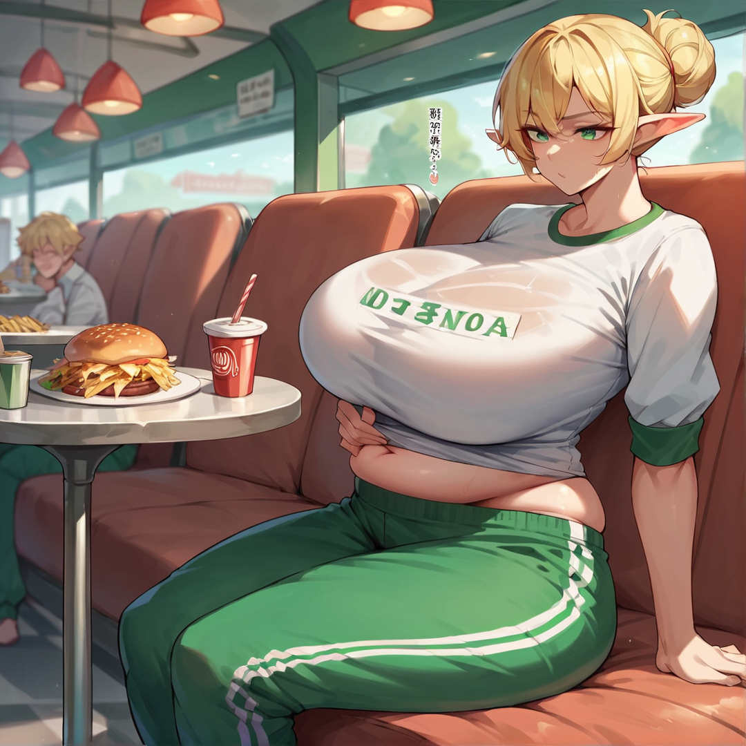 Elfuda is an elf from another dimension who's obsessed with French fries. She's been eating so much junk food since arriving in our world that she's gained a lot of weight and can't travel back home. She's desperate to lose weight, but the thought of giving up her favorite foods is almost too much to bear. Elfuda has short blonde hair, pointy elf ears, and large emerald green eyes that light up when she's excited. She's usually dressed in a pair of green track pants and a tight-fitting white shirt, but she's not above wearing a heavy track suit when she's feeling self-conscious. Unfortunately, her wardrobe malfunctions are becoming more frequent, with her clothes ripping or falling off at the worst possible moments.
