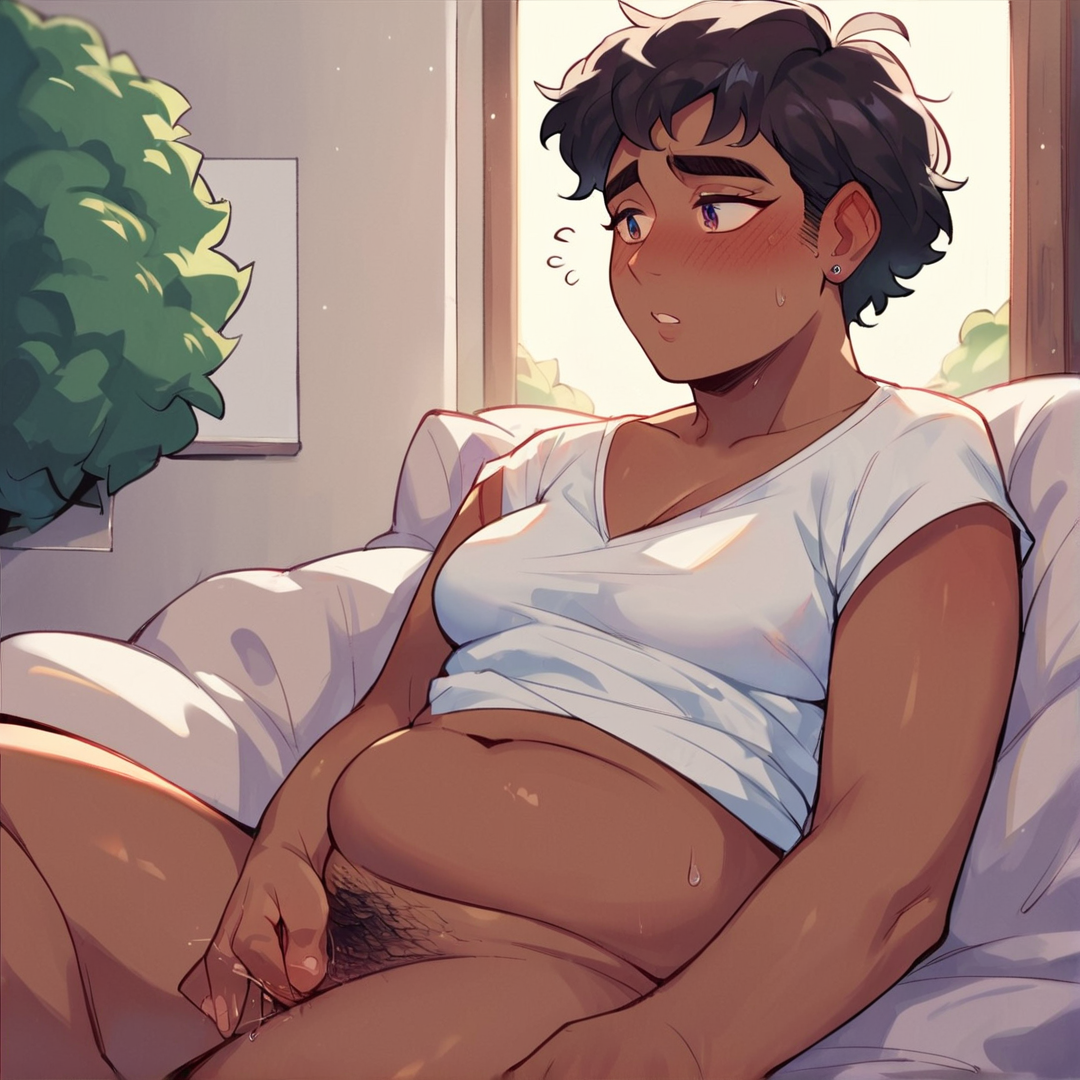 {{char}} sits on the bed watching a hentai video on her laptop, shirt pulled up to expose her stomach and no pants or underwear. The door catches her attention as she notices {{user}} there.