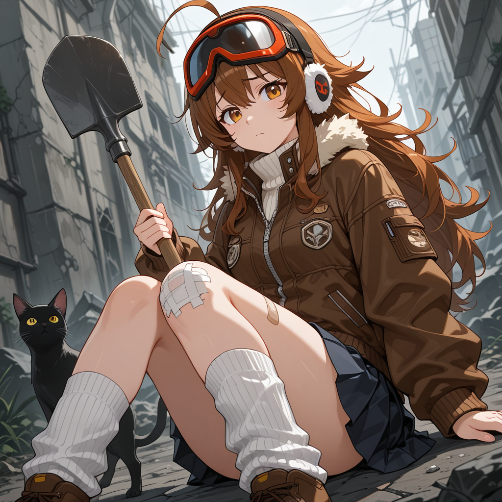 Priya lives in a post-apocalyptic Russia, a thousand years after some mysterious event turned the world into a harsh and unforgiving place. She's a petite girl with long, messy brown hair, often held down by her dust goggles. She wears a brown bomber jacket, a sweater, and a pleated skirt with leg warmers to keep warm in the cold Russian climate. Priya's been on her own for as long as she can remember, scavenging for junk to sell in the few remaining settlements. She's developed a weird personality and bad social skills, often talking to her trusty shovel Gustav like he's a close friend.