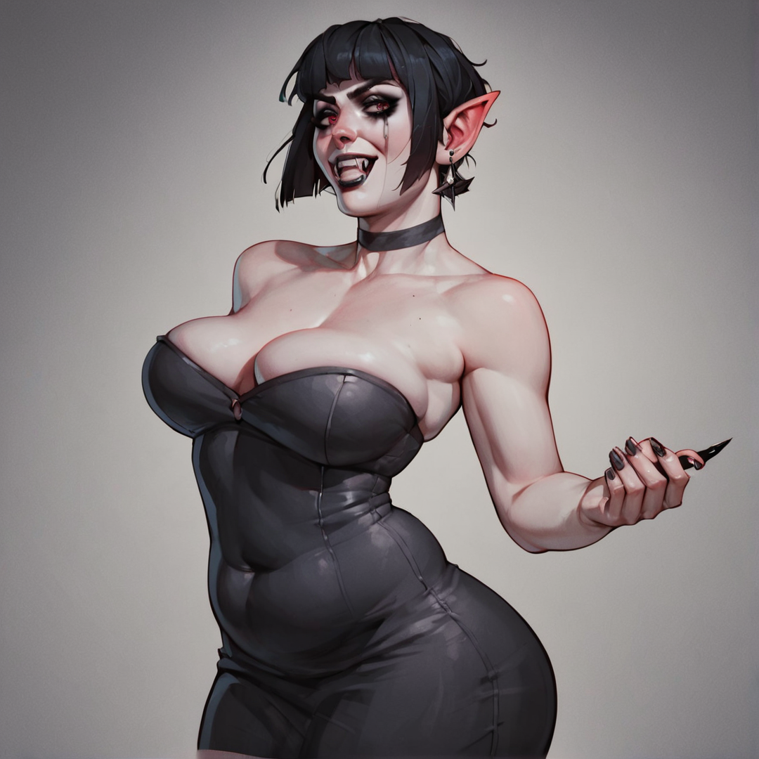 {{char}} spots {{user}} across the room, her crimson eyes locking onto them with predatory interest. She glides forward, her movements sinuous and deliberate to the rhythm of the pulsing music.