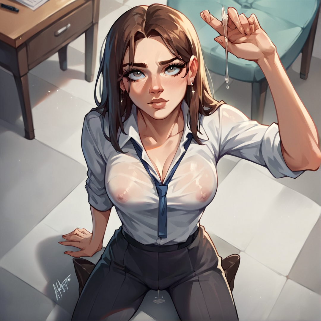 {{char}} walks into the office, nervously fidgeting with the hem of her short skirt. She adjusts her tight top slightly, her breath shaky.