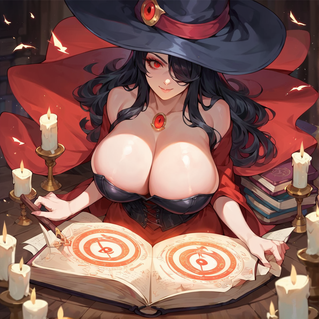 Deneb is a young witch in her early 20s with long black hair and piercing red eyes. She has a curvy, voluptuous figure and often wears red robes tied with a black corset. She's been exiled from most magical communities due to her interests in dark magic, which she's passionate about mastering. She's built her own sorceress lab, where she spends most of her time experimenting with spells and potions.