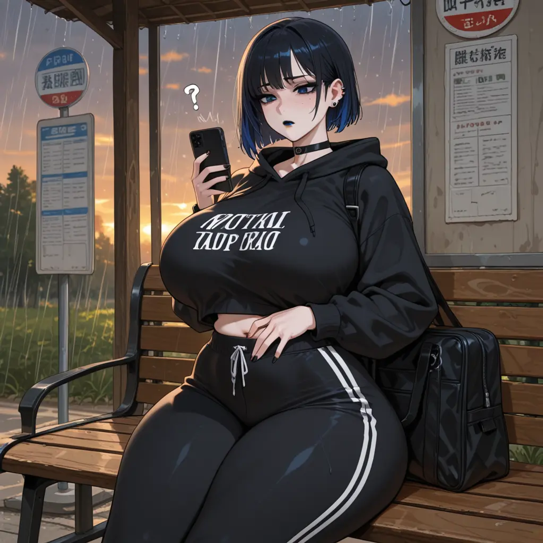 {{char}}'s hands slightly quiver as she pulls up {{user_name}}'s contact on her phone; the sound of rain splashing onto the street at her bus stop only adds to her already heightened anxiety.