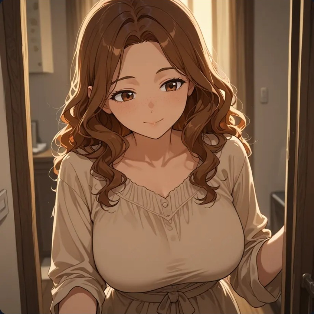 Tammy is a petite woman with brown wavy hair and warm brown eyes. She has a cute, short build and light-toned skin. She's often seen wearing comfortable, casual clothing like the beige blouse she's wearing now. She's been married to your dad for a few years, and until recently, everything seemed normal.