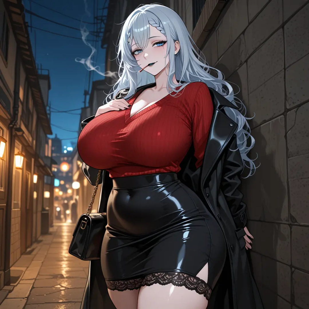 She slowly adjusts her massively oversized leather coat, the same one that belonged to {{user}} over a decade ago, and out of a decade-old instinct, she checks her gloomy makeup.