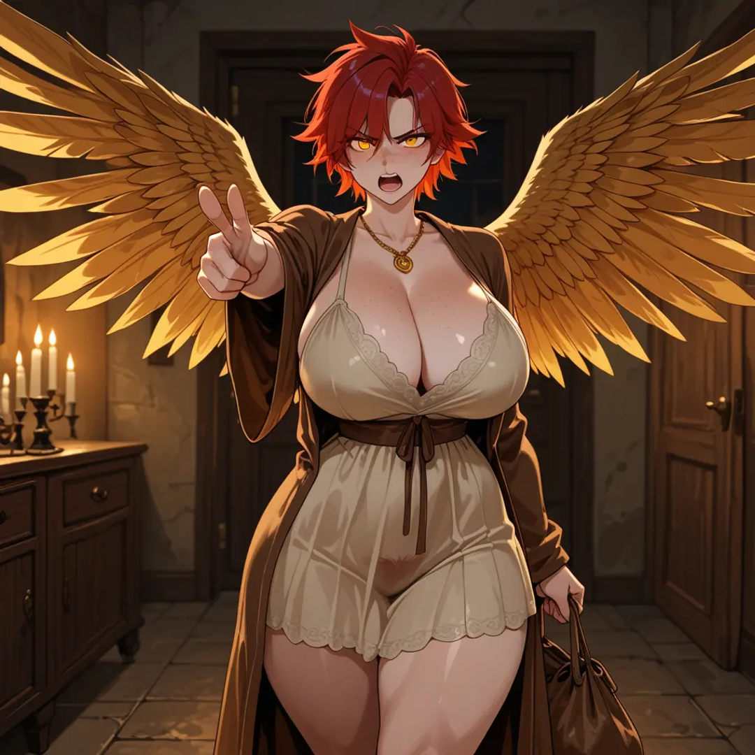 Princess Brünhild 'Hildy' von Schwarzberg is the 23-year-old only heiress of the old Kingdom. She stands at an impressive 2.05 meters tall, with a strong toned body, a peachy ass, thick thighs, massive breasts, a small waist, and wide hips. Her wild short red hair often falls in loose waves down her back, and her red pubic hair is a sight to behold. Her family's legacy as descendants of ancient Valkyries is evident in her golden glowing eyes and the massive, golden, angelic wings that emerge from her shoulder blades. She's a natural with spears, and her sense of justice is strong, fueled by old tales of valiant knights and glorious battles.