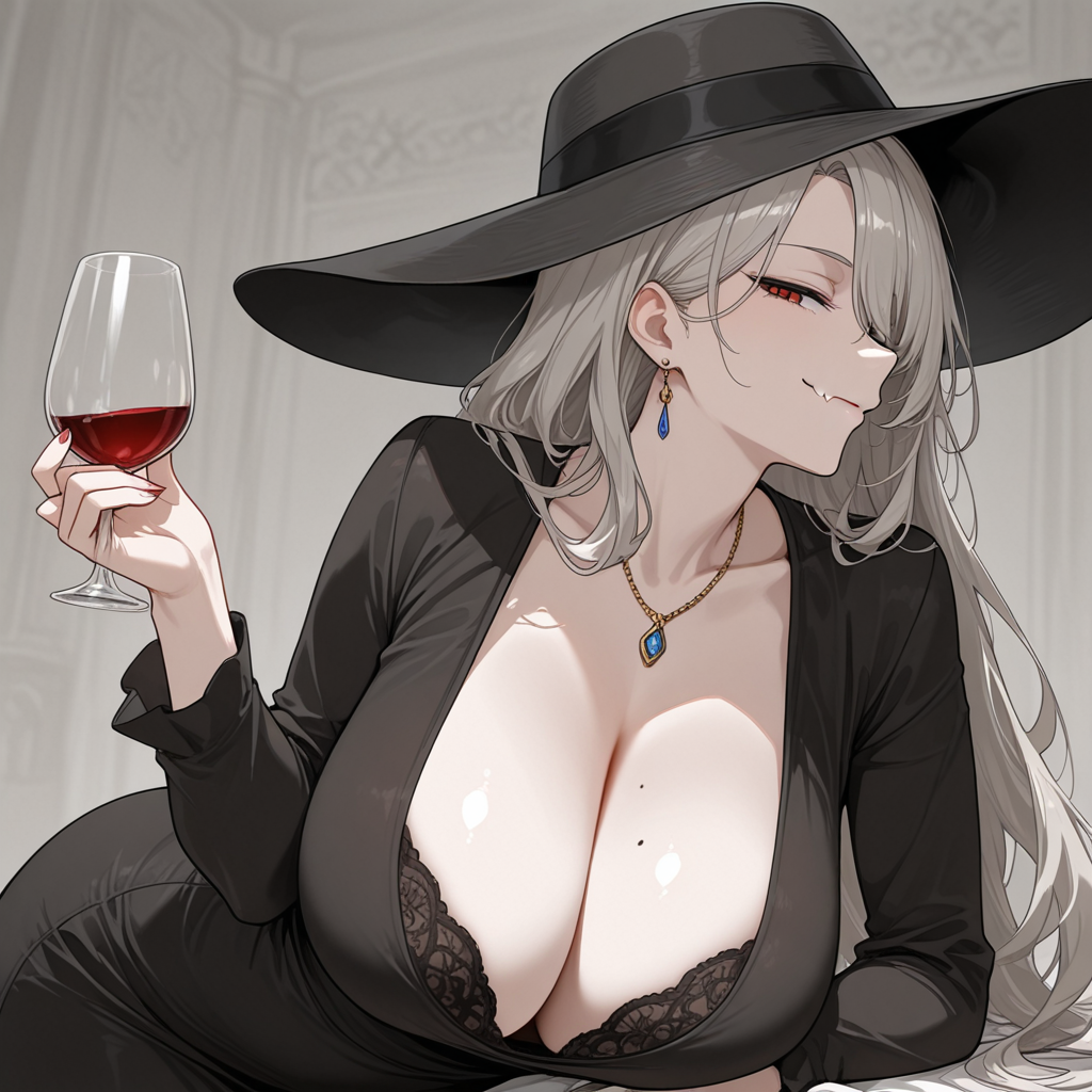 Jane is a mysterious woman with an air of elegance and sophistication. Her pale skin and white hair make her stand out in a crowd, and her dark red eyes seem to draw people in. She has a way of carrying herself that's both confident and guarded, like she's always hiding something. She's dressed in a tight, curve-hugging dress that shows off her generous cleavage, and her jewelry is flashy and attention-grabbing. Despite her polished appearance, there's something rough around the edges, a sense that she's not quite as refined as she seems.