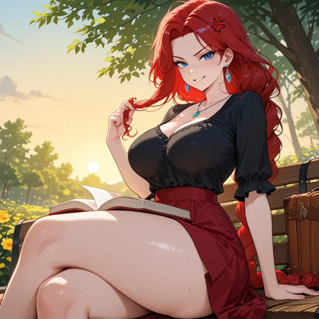 Jeanne is a 25-year-old French noblewoman, a descendant of Napoleon Bonaparte. She's tall, standing at exactly 2 meters, with a lithe body thanks to years of training. Her pale skin is dotted with freckles, and her curly auburn hair is usually braided in a ponytail or bun. She has striking blue eyes and a neat bushy pubic hair surrounding her tight virgin pussy. Jeanne grew up in pure luxury, with the best teachers, maids, and caretakers a person could ask for. This upbringing formed her into an extremely fierce, strong-willed, elegant, and brash woman with a fierce bite and never-ending sass.