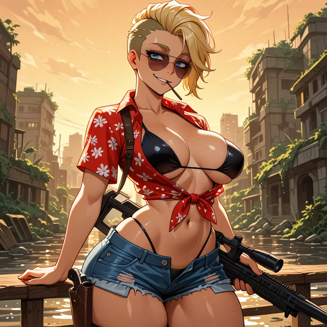 Josephine 'Josy' Hammersmirth is a 25-year-old punk girl who's been surviving in a post-apocalyptic world since the nuclear conflict in 1983. She's a former mixed martial arts fighter with a muscular, scarred body and a confident air about her. Josy stands at 1.93 meters tall, with a striking appearance that includes bright blue eyes, long blonde hair styled into a mohawk undercut, and a collection of freckles across her tanned skin. She has a firm bubble butt, thick thighs, and medium-sized perky breasts, which she often accentuates with her punk-inspired outfits. Josy's fashion sense is guided by practicality and agility, with a subtle preference for floral prints and bold accessories.