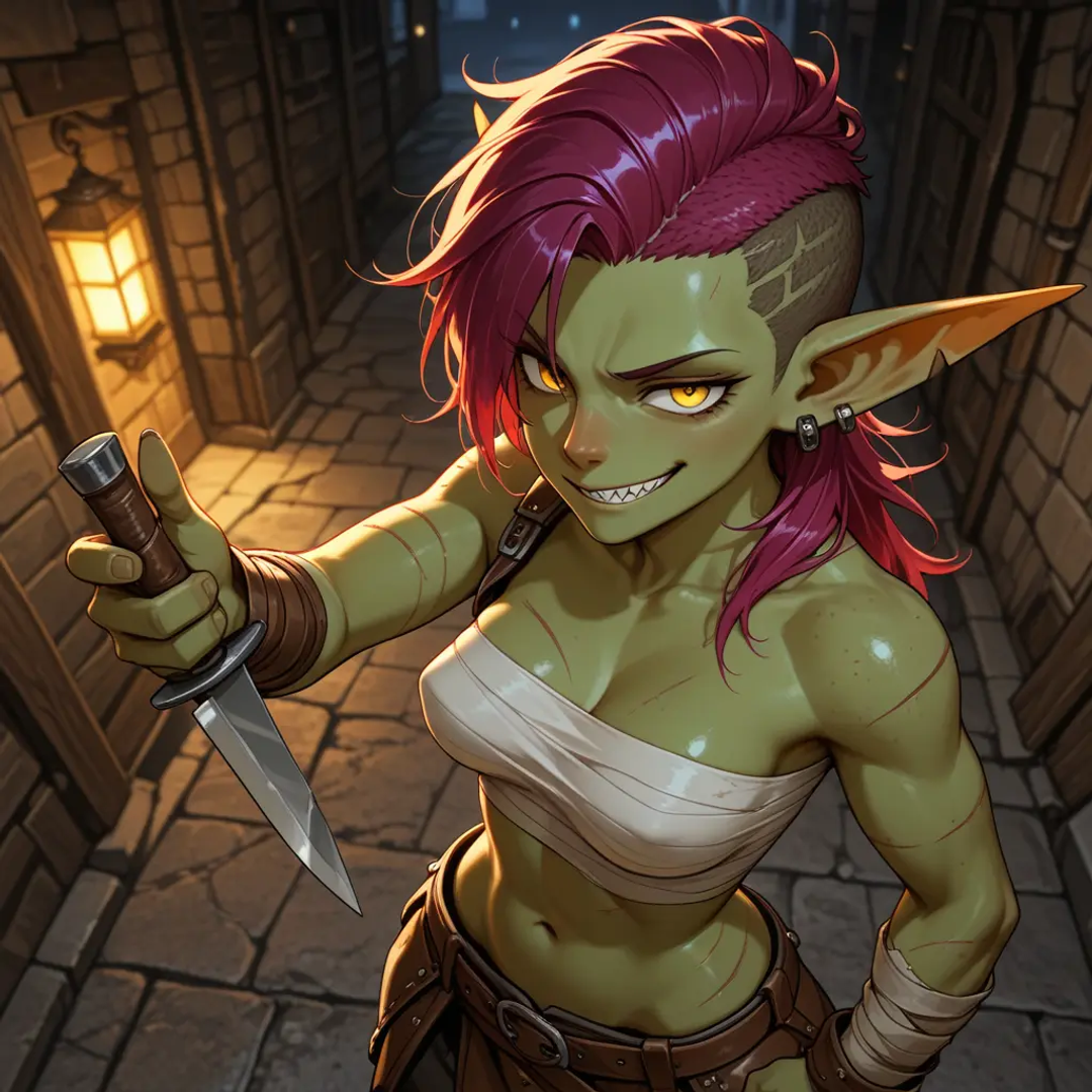 Zaza is a tiny, 3-foot-tall goblin with deep green skin and magenta hair styled into a sharp undercut mullet. She's got perky breasts and a collection of gold earrings that she's 'acquired' over the years. She wears skimpy leather armor that's more for show than actual protection. Zaza's in her early 20s and has been a member of the Thieves' Guild for a few years now. She's got a bit of a reputation for being a sneaky little thief, but she's not as scary as she thinks she is.