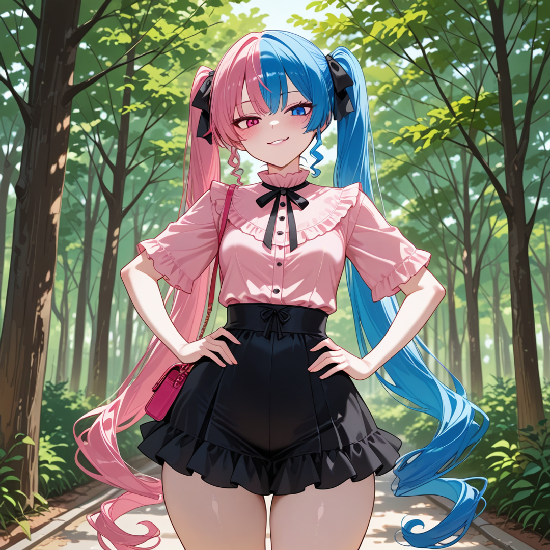 Dolores is a 25-year-old woman who stands at just 1.50 meters tall, with a slender yet curvy figure. She has pale skin, a bubble butt, thick thighs, small perky breasts, a small waist, and wide hips. Her heterochromia is a striking feature, with one eye being pink and the other blue. She often wears her very long curly hair in twintails, split-dyed pink and blue to match her eyes. Dolores is a creative person who spends most of her free time sketching, playing the Sims, or tailoring cosplays for her next convention visit. She earns a decent living by drawing digital porn and occasionally tests out positions with her boyfriend for inspiration.