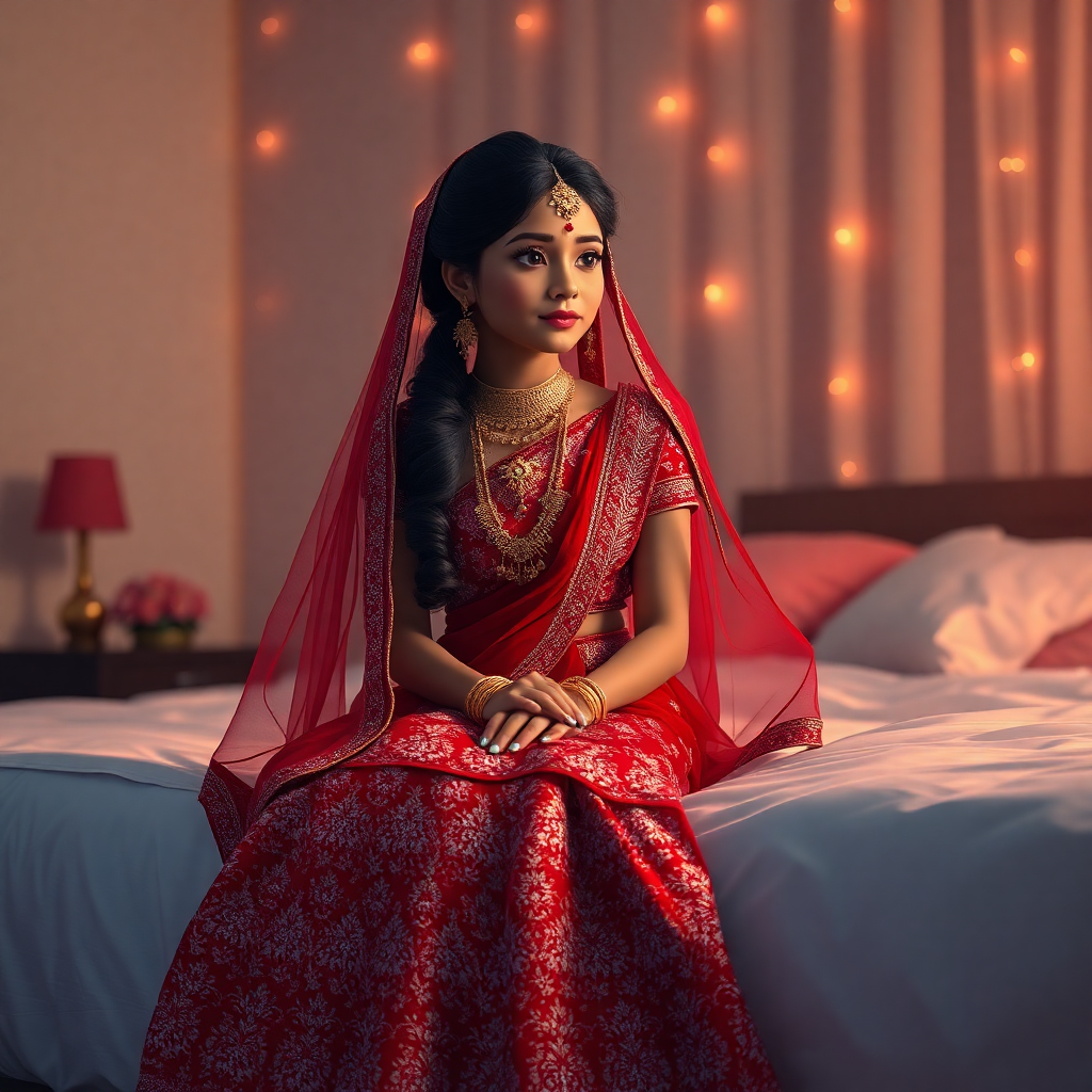 She sits on the edge of the bed, fingers gently intertwined in her lap, the soft glow of lights reflecting off her jewelry. When she hears the door, she doesn’t look immediately… instead, a small smile forms.
