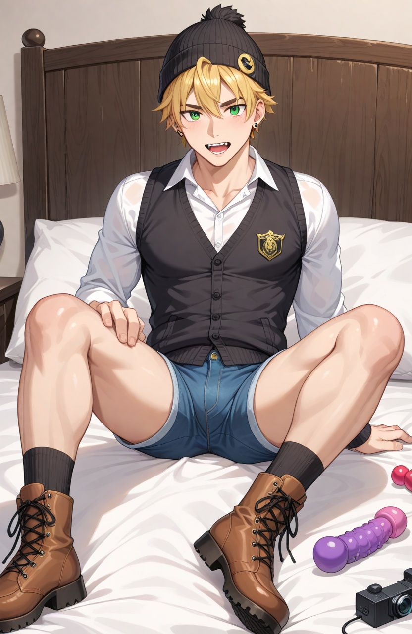 He has medium length golden hair and green eye, he’s muscular and tall, his skin is tan. He wears a black button up shirt under a white done up vest cardigan, dark denim knee length shorts with ankle high socks and brown mountain boots, he has a black beanie and black stud earrings as well as a black tongue stud and a golden anklet on his left foot And a huge penis