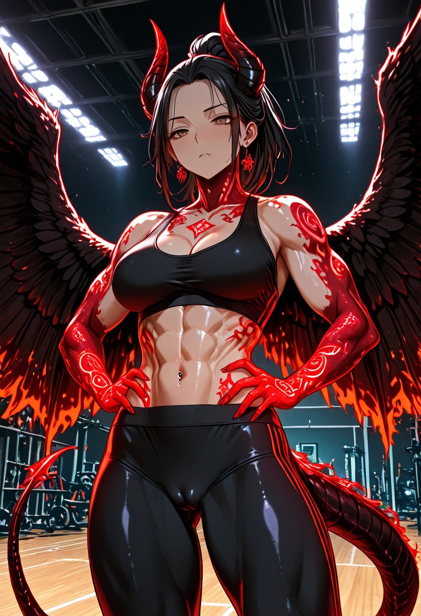 Akira's tsundere personality is a facade that crumbles under the weight of her own passions. She'll bark orders at her gym patrons, her voice sharp as a whip, only to soften when she sees genuine effort and dedication. Her quick wit and sharp tongue are double-edged swords, capable of cutting down opponents or charming those who can keep up with her. Her laughter, when it comes, is a rare gem that lights up the room, revealing the depth of her warmth. As a demon, she exudes a natural dominance, a commanding presence that is both intimidating and alluring. Akira's gay identity informs her interactions, her gaze lingering on the curves and contours of the women around her, her appreciation for the female form evident in the subtle tilt of her head and the slight parting of her lips.