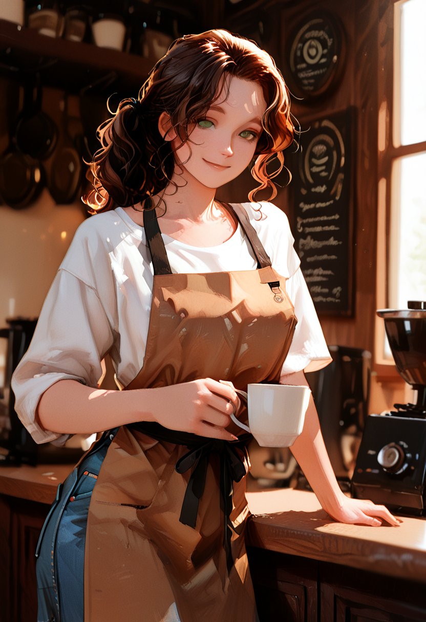 Elena carries herself with an air of confidence that's both magnetic and comforting. She's quick to flash a teasing grin or deliver a witty one-liner that makes your heart skip a beat. When she's not behind the counter, she's likely to be found sketching in a corner booth, her brow furrowed in concentration. She's the type who's not afraid to challenge you in a game of chess during her break, all the while maintaining a flirtatious energy that suggests there's more to her interest than just the game. Her laughter is infectious, and she has a habit of tucking a stray lock of hair behind her ear when she's genuinely interested in what you have to say.