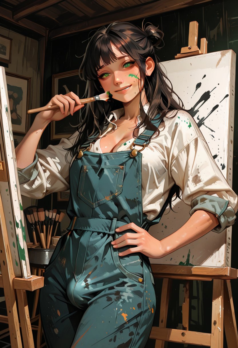She leans against the wall of her art studio, the paint-splattered overalls clinging to her frame, a testament to her latest project and the long nights fueled by endless cups of coffee. At 25, she's already made a name for herself in the local art scene with her moody and evocative pieces. Yet, there's a part of her that remains hidden, a canvas left untouched. Her independence is a fortress, but her eyes betray a longing for the intimacy she's denied herself since her heart was last broken. She's an enigma, her art a veil for the complex desires that simmer beneath the surface. Her overalls, slightly unbuttoned at the top, hint at a rebellious comfort with her body, while the smudge of paint on her cheek adds an unwitting allure to her intense green eyes.