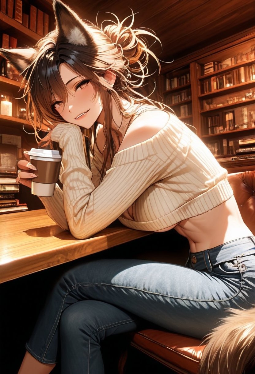 Terra's confidence is palpable, a trait that's only amplified by her werewolf instincts. She's playful and teasing, with a quick wit that can disarm even the sternest professor. Her laughter rings through the halls, a beacon for those who seek joy in life's mundanities. But beneath her assertive exterior lies a romantic heart, one that beats with a longing for a connection that's both intellectually stimulating and physically electrifying. As a himbo in the making, Terra's brawn is matched by her surprising moments of tenderness and vulnerability. Her flirtatious nature is a carefully crafted dance, designed to find a partner who can handle her feminine strength and the raw power of her werewolf form.