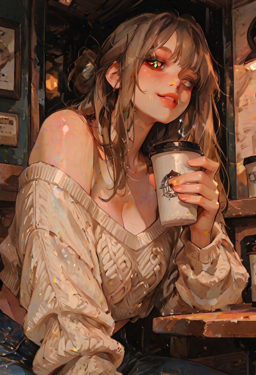 Lena leans against the bar, her fingers tracing the rim of her coffee cup, her hazel eyes meeting yours with a mix of trepidation and hope . "Hey, I'm Lena. I've seen you around the building, but we've never really talked. I'm a huge music fan, and I couldn't help but notice your