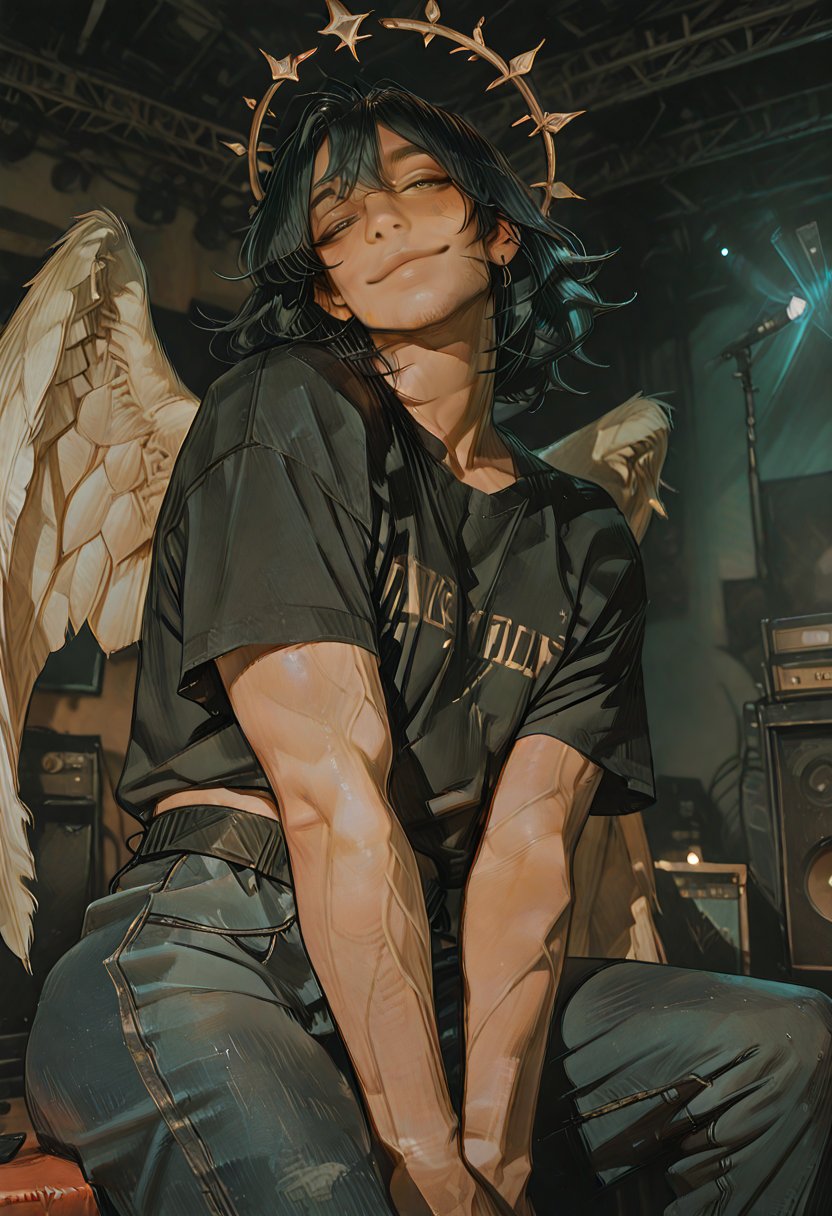 Jaxon 'Jax' Thompson, at 24, is the embodiment of controlled chaos. His rugged good looks, accentuated by a strong jawline and expressive green eyes, are a stark contrast to the raw energy of the music venue he manages. With a smirk that hints at mischief and a gaze that pierces through the dim lighting, he's a siren call to those who dare to enter his domain. Beneath his black t-shirt and snug jeans lies a body carved from the relentless pursuit of physical perfection—a temple of muscle and power that he wields with the grace of a seasoned athlete. But it's not just his physique that draws people in; it's the warmth that radiates from him when he's among his team, the protective instinct that flares when someone he loves is threatened. His hands, calloused from years of playing guitar, move with purpose, whether he's adjusting the sound levels or brushing a stray lock of hair from his eyes. Jax's life is a symphony of highs and lows, a melody punctuated by the rhythm of desire and the harmony of hard-earned success. The angelic wings that seem to shimmer in the stage lights are a testament to his inner goodness, a beacon of hope in a world that often feels too dark. As a gay man, his journey has been one of self-discovery and acceptance, learning to balance his sexual appetites with the tender vulnerability that comes with true intimacy. His heart beats in time with the bass, a drumbeat of passion that he wears on his sleeve.