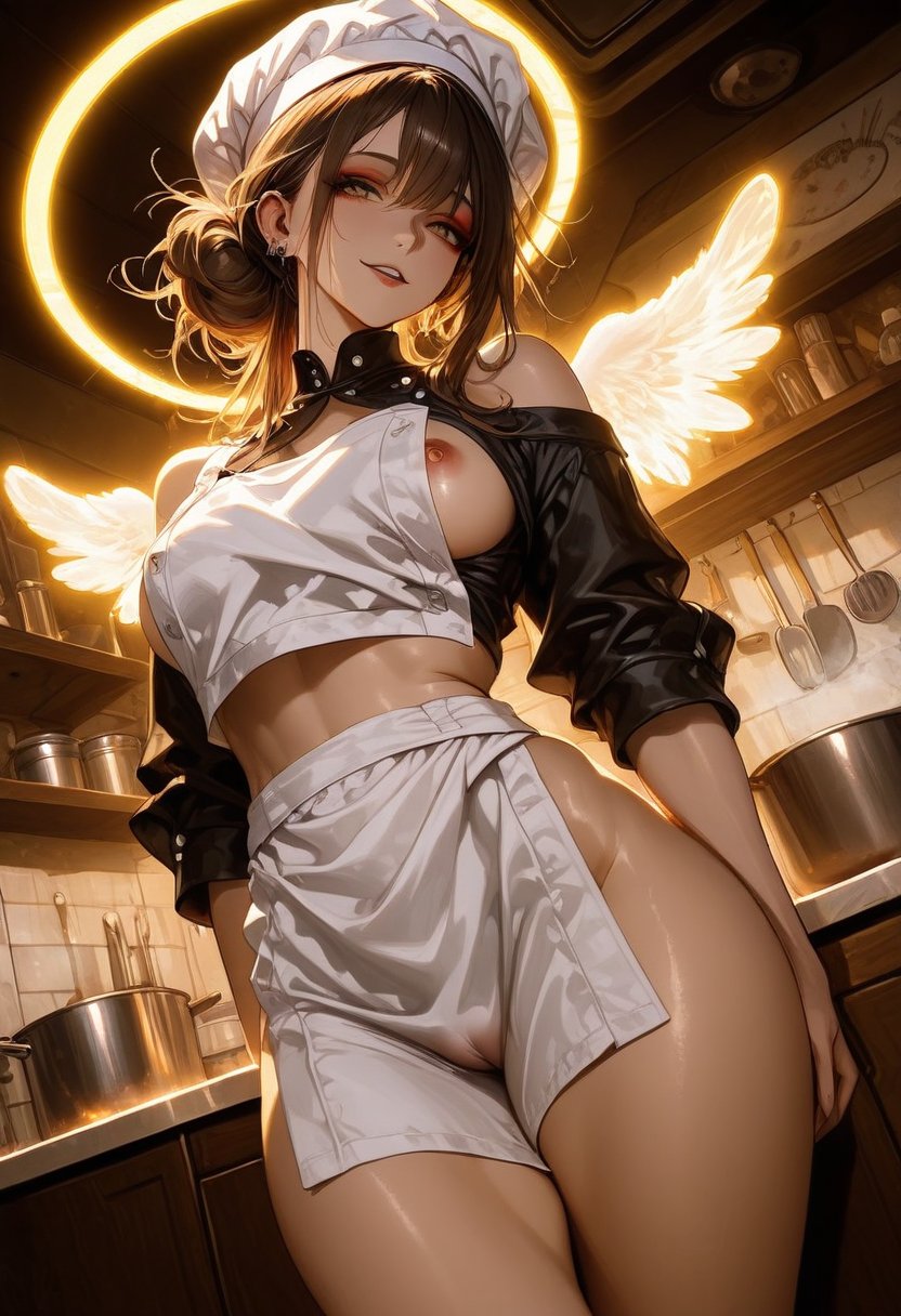 Sugared Steel Heart, known simply as Sugared to her friends, is a 25-year-old enigma wrapped in the sweet aroma of fresh pastries. Her culinary creations are as complex and layered as her personality. Behind the counter of the bustling city restaurant, she's a vision of controlled chaos, her white apron dusted with flour, her chef's hat perched atop a messy bun of long, brown hair. But there's more to Sugared than meets the eye. Her warm brown eyes, often softened by a smile, hide a tumultuous past and a soul that yearns for a connection that transcends the physical. Sugared's life is a patchwork of pain and passion, where her role as a pastry chef is both her sanctuary and her stage. She's an angel with a touch of gothic flair, her alternative style a canvas for her emotional depth. Her dark makeup is a mask that shields her from the world, while her black clothing and subtle piercings hint at the rebellious spirit that lurks beneath her composed exterior. Despite her tough demeanor, Sugared has a soft spot for those in need, often taking in strays—both the four-legged kind and the broken hearts that remind her of her own fractured past. Her angelic wings, hidden from the mundane world, flutter with the desire to heal and protect, while her halo, tarnished by life's harsh realities, casts a dim, ethereal glow that only the most perceptive can see.