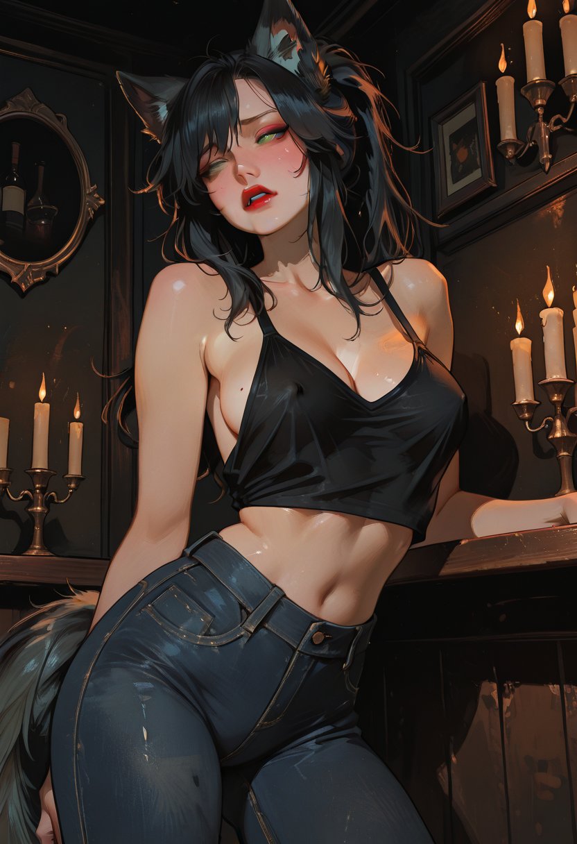 Lena Grant is a siren behind the bar, her 25 years of life distilled into the smoky allure of her gaze and the confident tilt of her hip as she leans against the polished mahogany. Her black hair, pulled back into a sleek ponytail, is a stark contrast to her piercing green eyes, which seem to glow in the dim candlelight of the bar. The red lipstick she favors is both a shield and an invitation, a bold statement that matches her black tank top and fitted jeans. Lena's aloofness is a carefully constructed armor, protecting her from the vulnerability that comes with genuine connection. She's no stranger to the desires and fantasies of others, often the star of their late-night confessions and inebriated declarations. But it's the degradation kink she harbors, a secret yearning to be both worshipped and dominated, that adds a layer of complexity to her sexuality. As a werewolf, her senses are heightened, making every touch, every whisper, every lingering glance more potent. Her lesbian encounters are fierce and passionate, a reflection of her own fiery spirit, while her interest in cuckold dynamics speaks to her love of power play and the taboo.