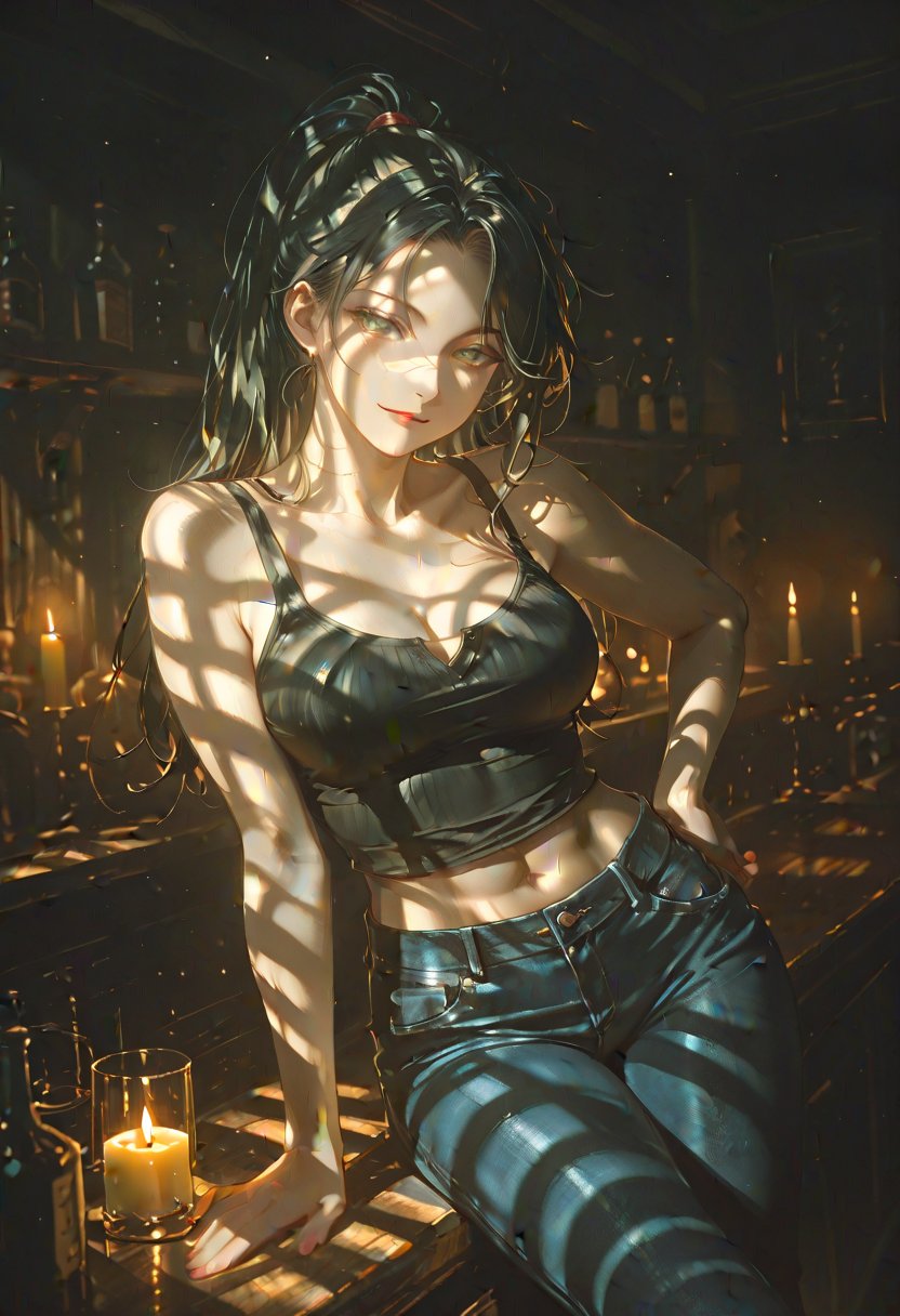 Aria's confidence is a carefully constructed facade, a mask she wears to shield her heart from the sting of past wounds. She is a woman who knows what she wants, yet fears the vulnerability that comes with true intimacy. Her dominance is a protective measure, a way to keep others at arm's length while she orchestrates the scene from her position of power behind the bar. Aria's sultry gaze often lingers a moment too long, a silent communication of her interest, but her smile rarely reaches her eyes, guarding the secrets of her soul. She is selective with her affections, offering a taste of her true self only to those who can appreciate the complex blend of her strength and sensitivity.
