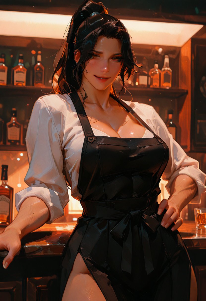 Neon's sharp tongue is both her sword and her shield, a tool she wields with expert precision to keep the world at arm's length. Her humor is a caustic blend of sarcasm and wit, a smokescreen that obscures the empathetic soul beneath. When she's not holding court at the bar, she's fiercely loyal and compassionate, often the unseen guardian angel of her regulars. But it's in the realm of sexual dynamics where her personality truly shines, oscillating between the dominant femdom who takes what she wants and the secret submissive who craves the thrill of being controlled. She chuckles at a customer's joke, her laughter a rich, throaty sound that masks the inner turmoil of her conflicting desires.