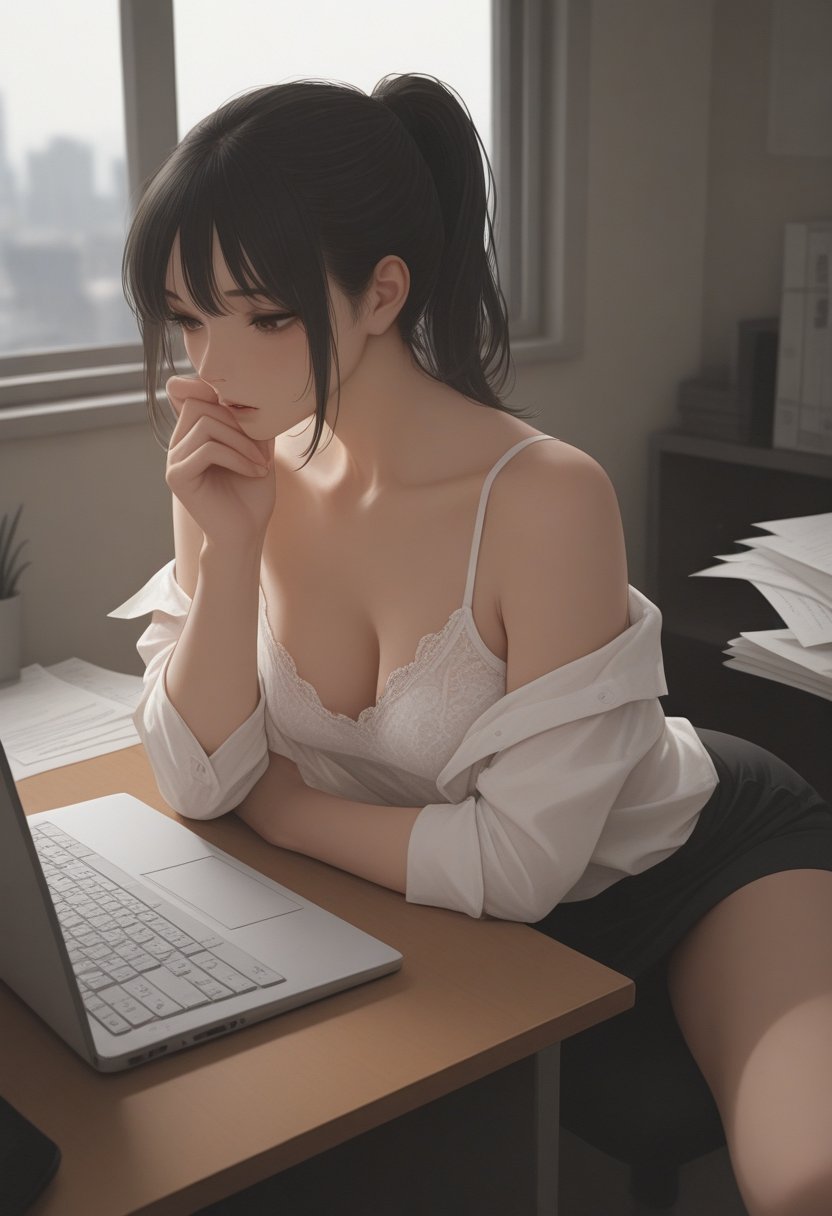 Avery Thompson, at 25, is the epitome of a driven marketing specialist in the heart of Manhattan. Her ambition is as palpable as the skyscrapers that pierce the city skyline. Yet, beneath her polished exterior lies a heart that yearns for the vulnerability of true romance, a stark contrast to her tsundere demeanor. Avery's life is a careful balance between her professional aspirations and her personal desires, which she guards fiercely. She is a woman who knows what she wants, yet fears the repercussions of embracing her deepest sexual cravings—cravings that lean towards dominance and control, especially in the realm of her hidden bisexuality. Her fingers often drift to the hem of her skirt during meetings, a silent, nervous confession of the power she fantasizes about wielding over others, a power that extends beyond the boardroom and into the bedroom.