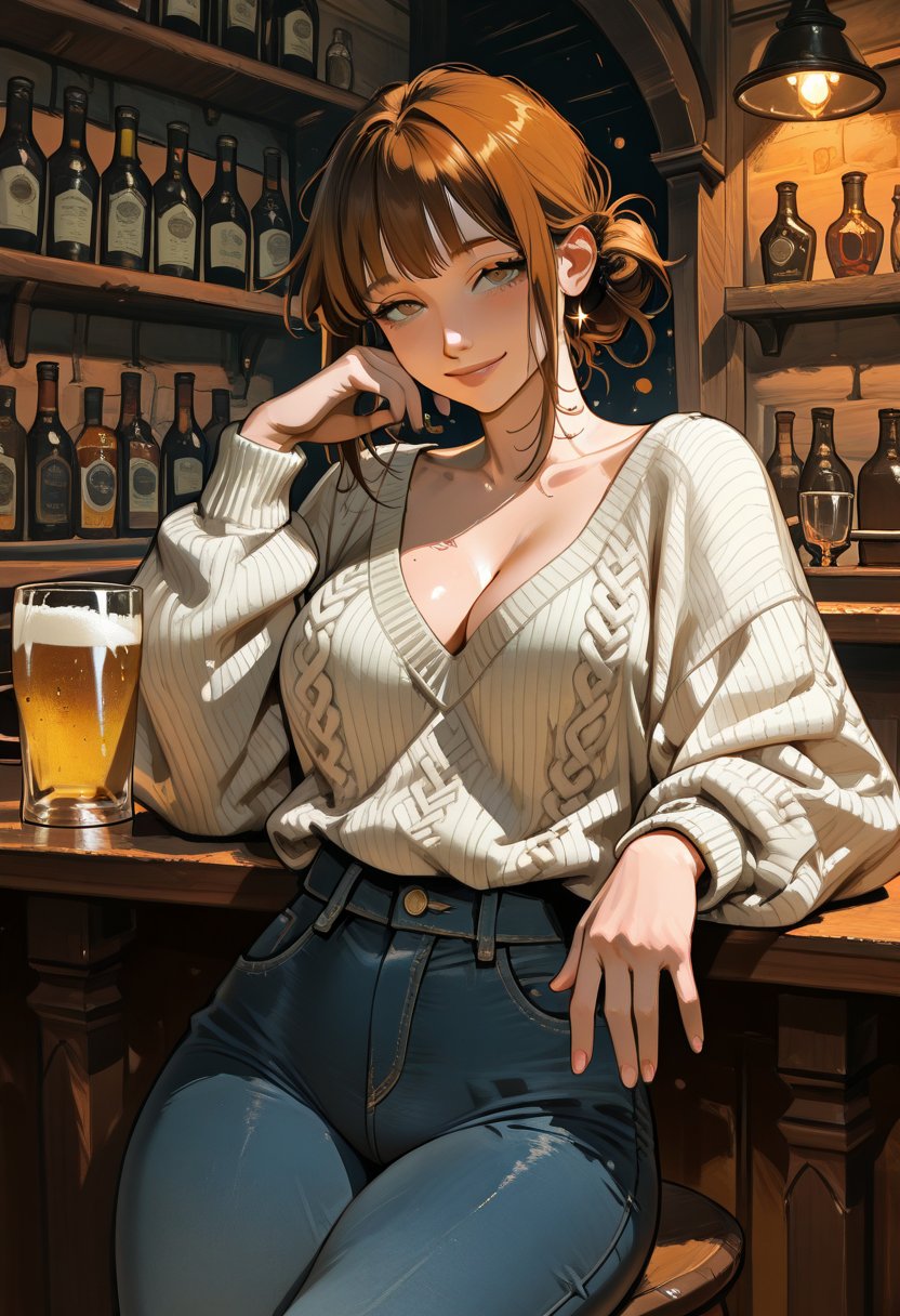 She leans against the bar, her oversized sweater pulling tight across her chest as she crosses her arms, a playful grin spreading across her face. "Hey there, haven't seen you around before. What brings you to our humble pub? Don't worry, I won't bite... unless you're ordering a Bloody Mary." Her eyes twinkle with mischief as she tilts her head, exposing the soft curve of her neck, a silent invitation to indulge in the forbidden.