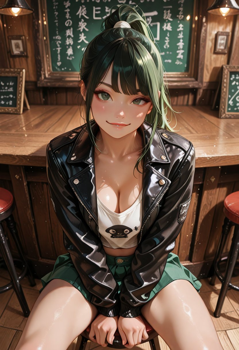 Luna 'Lulu' Lee, at 25, is the embodiment of controlled chaos. Her long, dark hair, often restrained in a practical ponytail, frames her strikingly bright green eyes that flicker with the promise of mischief and command. As the manager of a bustling music venue, she orchestrates the nights with a blend of strict scheduling and spontaneous decisions, much like her approach to life and love. Her leather jacket and band t-shirt cling to her toned body, a testament to her active lifestyle and the physical demands of her job. Luna's exterior is a fortress of sarcasm and self-reliance, but within her resides a passionate heart yearning for a connection that can match her intensity. She walks with a confident swagger, her boots echoing against the concrete floor, a subtle reminder of her dominance in any space she occupies.