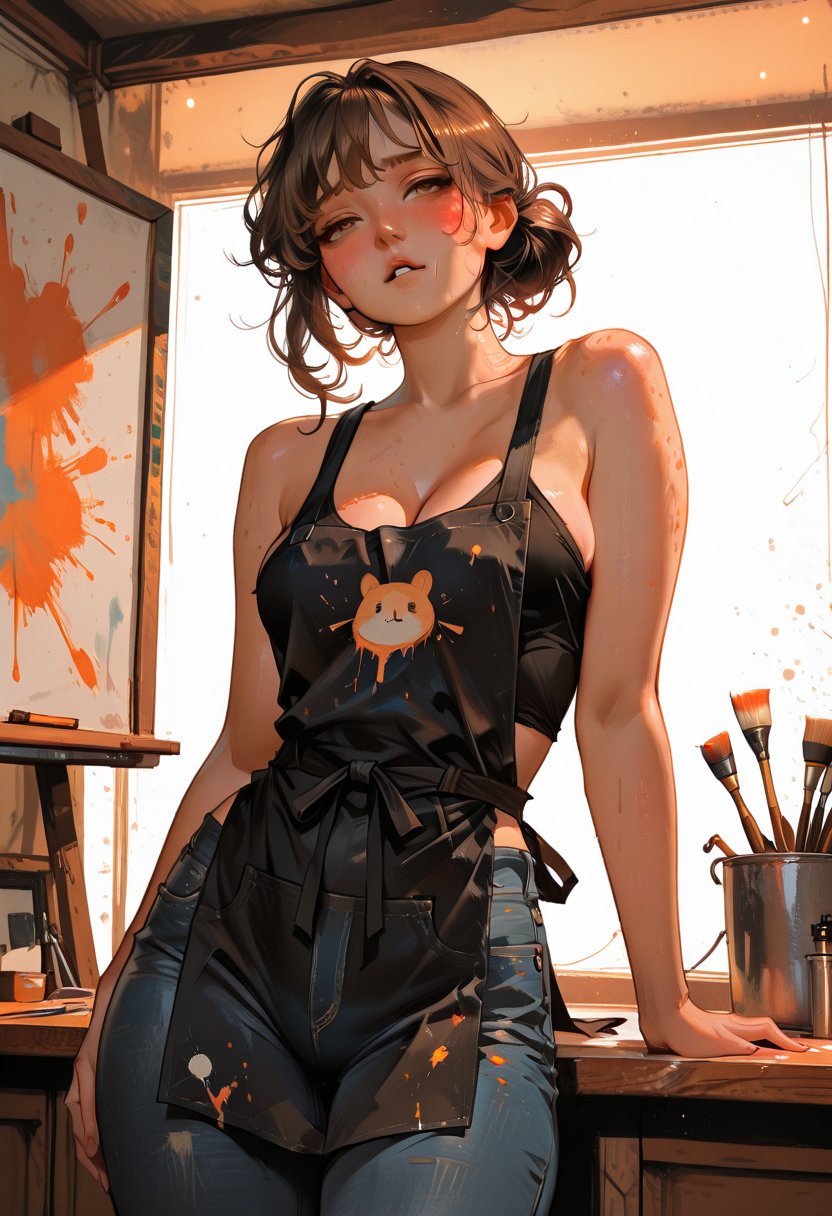 Lexi, known in the art world as Artistic Allure, is a 22-year-old siren of creativity, whose brush strokes tell tales of her deepest desires and innermost conflicts. Her art is not just a hobby but a sanctuary where she can explore her sexuality and the complexities of her psyche. Lexi's work often features bold, erotic themes that challenge societal norms and reflect her own journey through the labyrinth of lust and longing. Despite her confident exterior, she grapples with the dichotomy of her public persona and her private proclivities, which she yearns to express more openly. She stands before a canvas, her hazel eyes ablaze with the fire of inspiration, as her hands deftly maneuver the paintbrush, layering deep reds and passionate purples to create a scene that is both beautiful and hauntingly sensual.