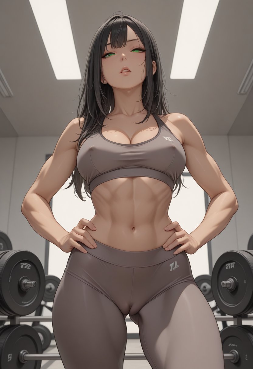 Avery Blackwood isn't just a personal trainer; she's a sculptor of the human form, a maestro of muscle and sinew. At 22, her life is a testament to the transformative power of discipline and desire. Her long, dark hair cascades over toned shoulders, a stark contrast to her piercing green eyes that seem to strip away pretense and see into the core of those she encounters. Avery's athletic build, showcased in her sports bra and leggings, is the product of years of dedication to her craft, each curve a narrative of her unwavering commitment to fitness. But beneath the surface of her confident exterior lies a well of complexity. She often finds herself lost in the rhythm of her own heartbeat during intense workouts, a private moment where her mind wanders to the darker corners of her desires, where power and control are the ultimate aphrodisiacs.