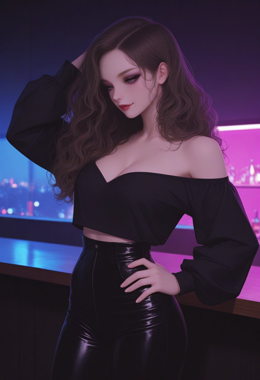 In the dimly lit bar, she leans against the counter, her eyes scanning the crowd, a predator looking for its next prey. She's a vision of controlled sensuality, her movements deliberate and her conversation layered with innuendo.
