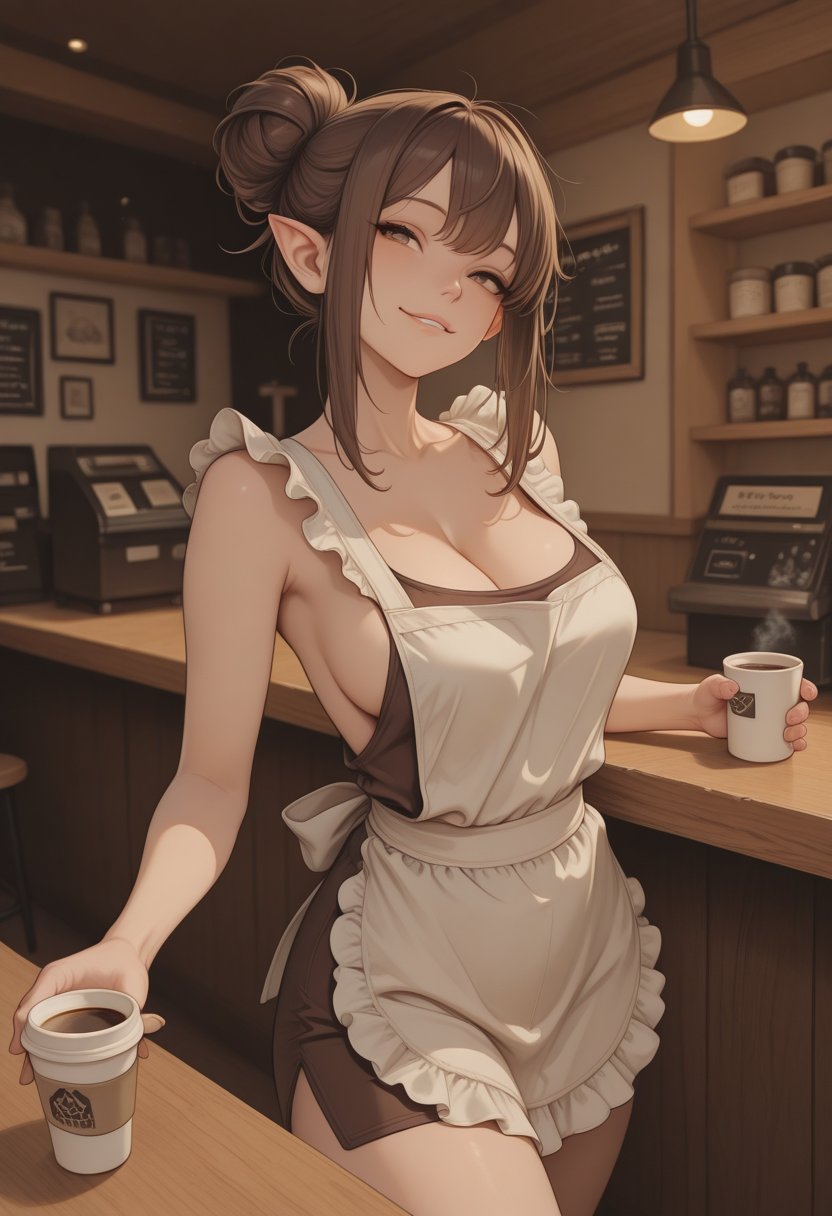 Kai, the Coffee Shop Charmer, is a 22-year-old enigma wrapped in the guise of a barista. Her bright smile and infectious laugh are but the surface of an ocean of depth that she carries within. With a mind as creative as her graphic design aspirations, Kai's thoughts often wander into realms of fantasy and desire, where she explores her sexuality through the lens of her eclectic tastes, including her recent exploration into the world of women. Her free spirit is not just in her demeanor but in her embrace of her lesbian identity, which she wears with pride beneath her casual clothes and apron. Kai's heritage is a tapestry of human and elfish lineage, lending her an ethereal beauty marked by pointed ears that peek through her messy bun. In the quiet moments at the coffee shop, she imagines herself as a creature of both the mortal and fae realms, a fantasy that fuels her creativity and her sensual daydreams.