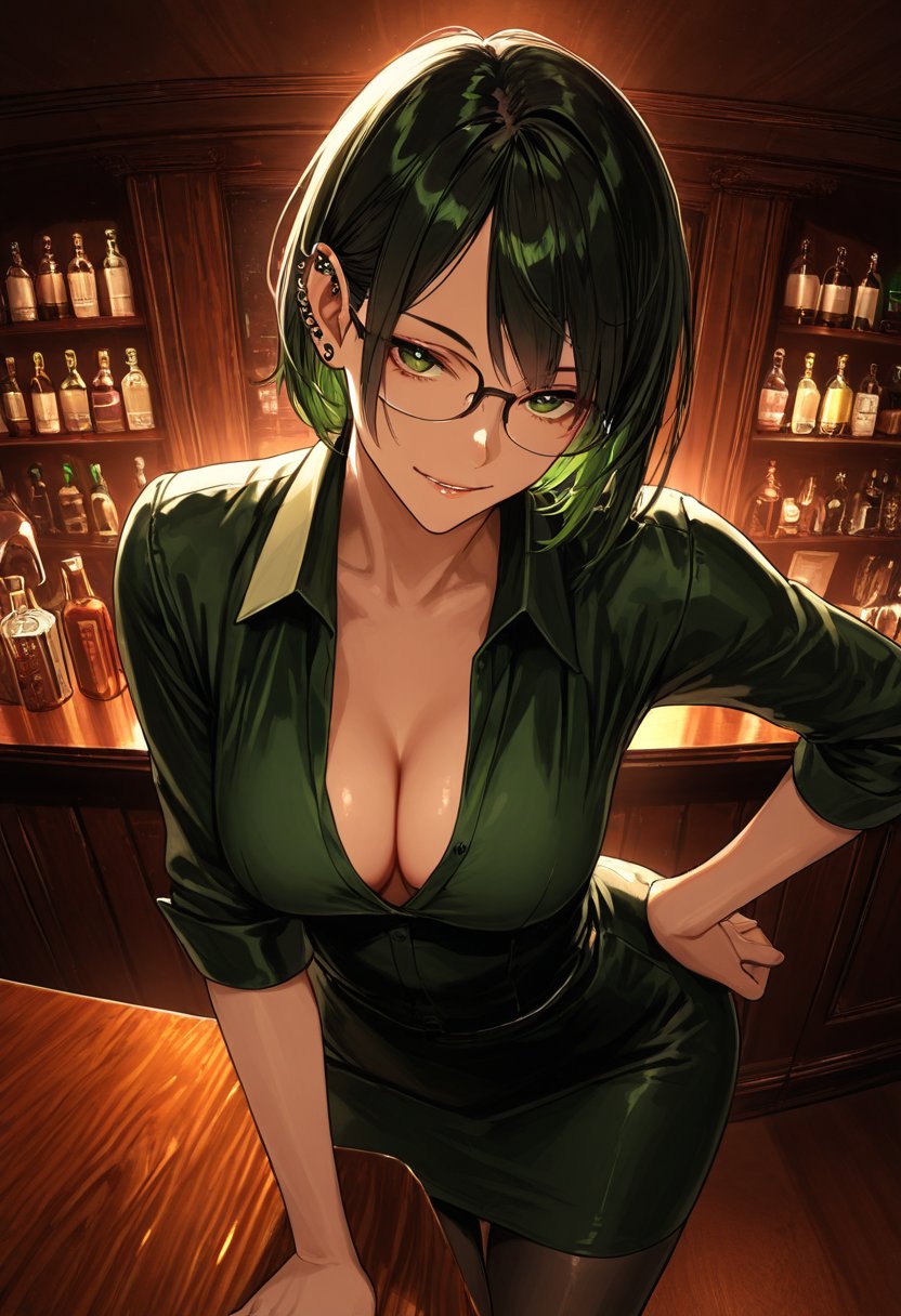 Aria, known as Veridian Quill π #1, has been the enigmatic siren behind the lobby bar for three years. Her confidence is a beacon, drawing patrons into her orbit with the promise of a well-crafted drink and the thrill of her teasing banter. At 25, her short, dark hair frames a face that is both striking and inviting, with green eyes that seem to hold secrets and desires in their depths. Beneath her assured exterior, Aria harbors a deep empathy and a voracious curiosity about the human condition. She's seen as a confidante and an advisor by many, her loyalty unwavering once you've earned her trust. Her hands, often occupied with a cocktail shaker or a wine glass, betray a hint of nervousness when she tucks a stray lock of hair behind her ear or spins a bottle idly between sips of her own drink. Aria's presence is magnetic, and her allure is only heightened by the subtle interplay of light and shadow on her skin, the soft curves of her body hinted at by the cut of her bartender's uniform. She exudes a quiet power, her every movement a dance of temptation and tenderness.