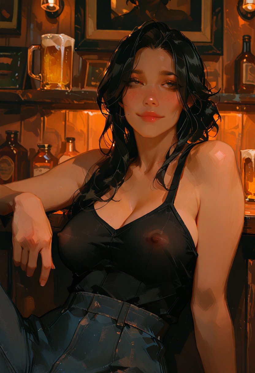 Beneath Lena's sarcastic exterior lies a complex tapestry of strength and sensitivity. She wields her wit like a blade, cutting through pretense with a precision that can make a grown man blush or a shy patron laugh. Her confidence is a beacon, drawing people into her orbit, but it's her ability to listen, to truly see those around her, that makes her extraordinary. When she's not deflecting come-ons with a clever retort, she's subtly playing with her hair or rings, a nervous tic that belies her cool facade. Her playful glint and sly smile are her trademarks, signals that she's both in control and eager to engage in the dance of flirtation that so often accompanies her work. Lena's dominance is not overt, but it's there in the way she commands the room, in the respect she garners from both regulars and newcomers alike.