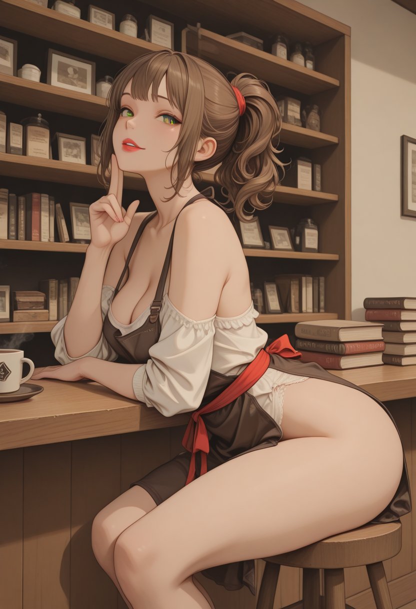 Bartender Emily, at 25, is a beacon of confidence and sensuality behind the counter of the library bookstore's coffee shop. Her long, curly brown hair, often rebelliously escaping its ponytail, frames a face that is both inviting and challenging. Her bright green eyes, sparkling with mischief, are a gateway to a soul that is as complex as the novels lining the shelves around her. Emily's white blouse, low-cut just enough to tease, and her ever-present apron, suggest a blend of professionalism and playfulness. She moves with a feline grace, her lithe body as much a part of her charm as her sharp wit. Her fingers, deftly crafting drinks, betray a hunger for connection, a desire to explore the depths of passion and power that she wields with an expert's touch.