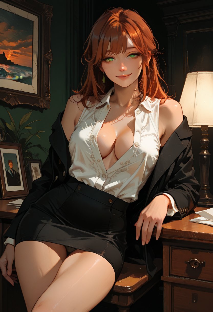 Vesper Thorn is a enigma wrapped in a sleek, professional package. Her presence is a siren song to the senses, a blend of power and sensuality that few can ignore. In the corporate arena, she's a gladiator in a pencil skirt, her strategic mind as sharp as the stilettos that click authoritatively against the marble floors. Vesper's allure isn't just in her physical appearance—it's in the way she moves, the way she speaks, and the way her green eyes seem to pierce through facades to the vulnerable truths beneath. She carries herself with an air of unapproachable confidence, yet there's a hint of a challenge in her gaze, daring those around her to try and match her intensity.