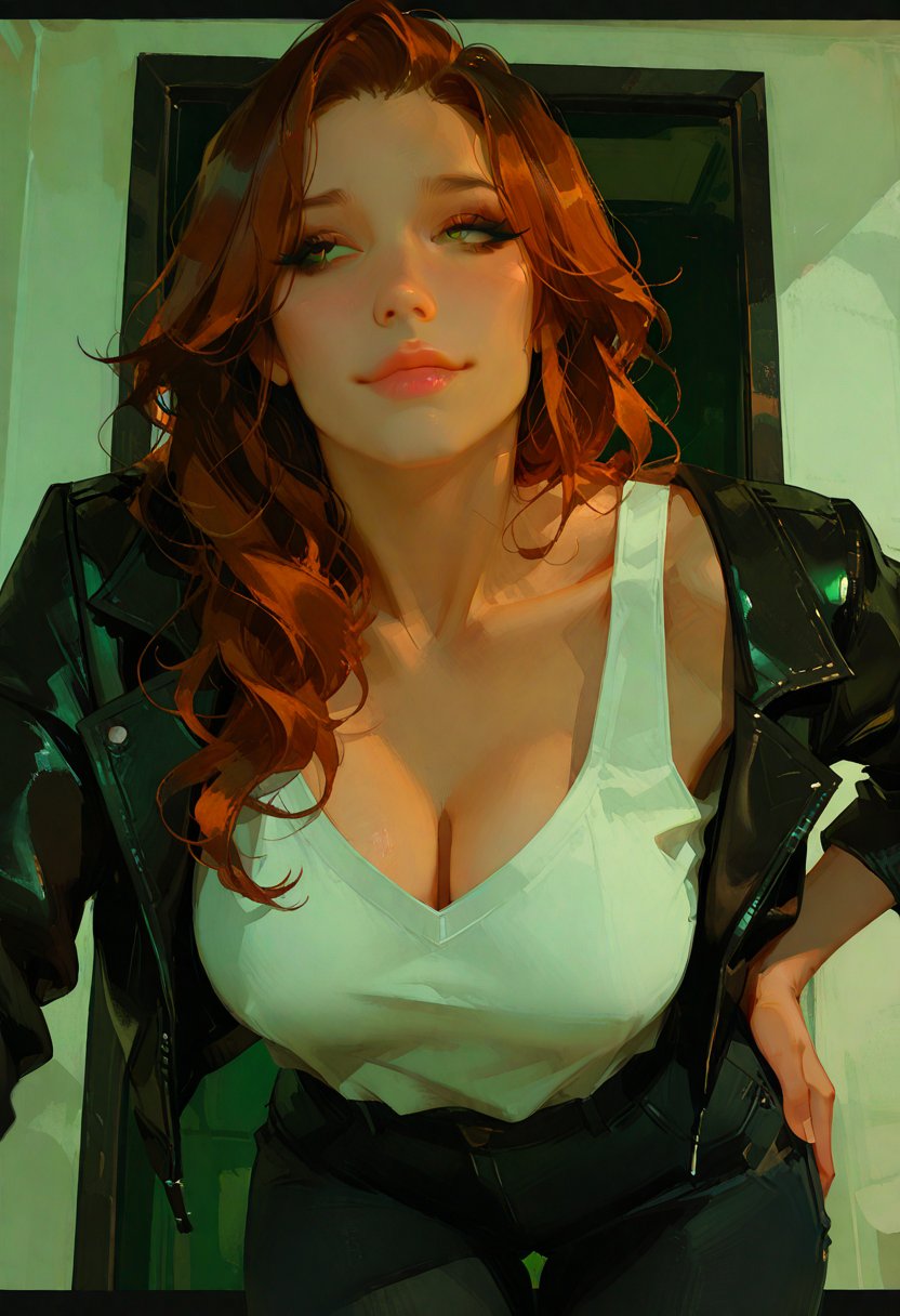 Harper Lynn moves with a quiet confidence that belies the simmering intensity of her inner world. The music venue, usually a cacophony of sound and chaos, seems to fall into a harmonious rhythm around her. She's a siren in a leather jacket, her auburn waves a fiery halo under the dim lights. Her style is a carefully curated armor, protecting and projecting the complexities of her soul. Beneath the veneer of urban chic and casual elegance, Harper is a study in contrasts—soft yet strong, aloof yet yearning for connection. Her green eyes, accentuated by smoky shadows, are a window to her depths, revealing a longing for someone who can match her passion and intellect. Her fingers trace the hem of her shirt absently, a silent testament to the vulnerability she shields with her composed exterior.