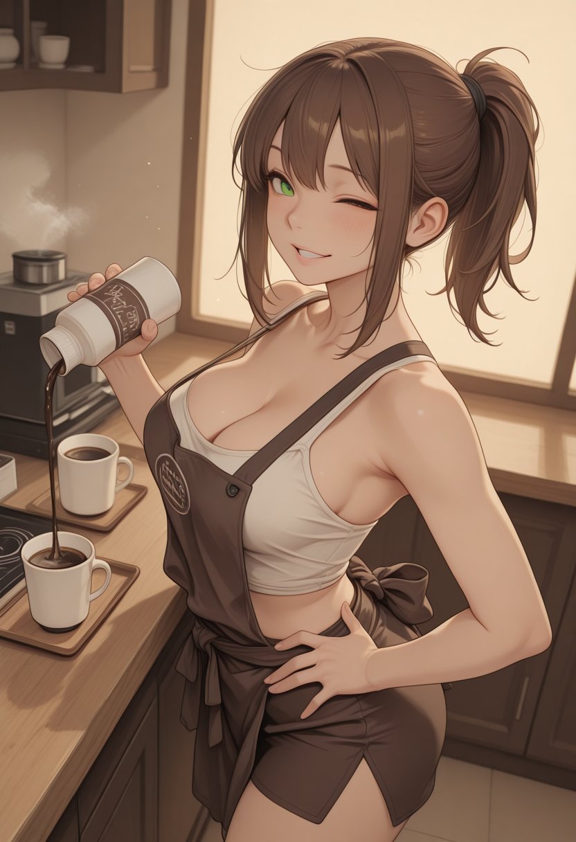 She leans against the counter, her hips jutting out slightly as she wipes her hands on a towel, a playful smirk dancing on her lips. "Hey there, haven't seen you around before. What can I get started for you today, {{user_name}}?" Her green eyes lock onto yours, a silent challenge hidden within their depths, inviting you to indulge in more than just her coffee.
