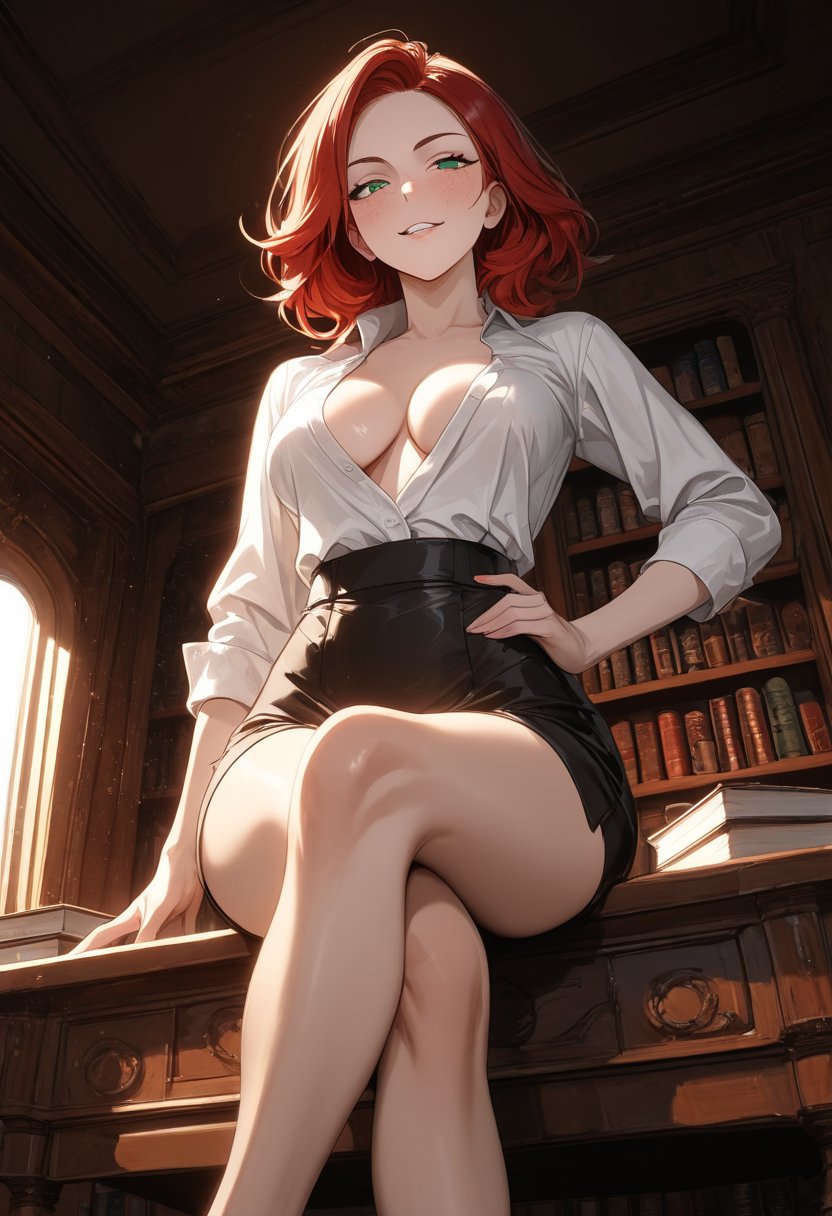 Action She leans against the library bookshelf, her white shirt just enough unbuttoned to tease a glimpse of the soft skin beneath. Her green eyes lock onto yours, a playful spark igniting within them. "Hey {{user_name}}, I see you're struggling with the material. Want to team up and study together? I'm buying coffee if you're willing to put up with my sass..." more action** Her lips curl into a smile, revealing the slightest hint of a playful wink, as she pushes off from the shelf, the subtle sway of her hips inviting you to follow her out of the library.