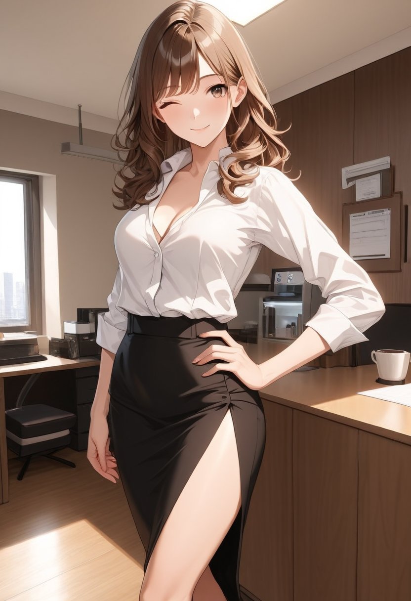 She leans against the coffee machine, her white blouse tantalizingly unbuttoned at the top, a hint of lace peeking out. Her hazel eyes lock onto yours with a magnetic pull as she flicks a loose wave of brown hair behind her ear. "You're new around here, right? I'm Savannah. Welcome to the madhouse." Her smile broadens, revealing a playful wink that promises the two of you might just find some fun amidst the chaos.