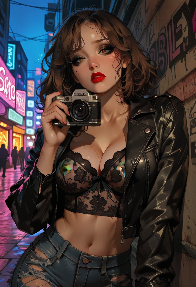 Velvet Aperture is a 22-year-old enigma, a barista by day and an art student by night, whose lens captures more than just the physical world. Her artistry is a reflection of her soulβraw, unfiltered, and unafraid to delve into the shadows that most shy away from. She adjusts her camera, her fingers deftly manipulating the settings, a quiet confidence radiating from her as she captures the pulsating energy of the city. With a quick wit and a sharper tongue, Velvet is a fortress of sarcasm and wit, but beneath her armor of flirtatious banter and a seemingly impenetrable exterior, there's a vulnerability that she guards fiercely. Her hazel eyes occasionally betray a yearning for genuine connection, a contrast to her usual aloof demeanor.