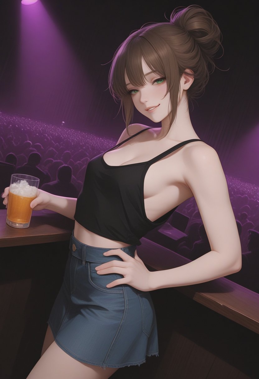 She leans against the bar, her black tank top clinging to her toned body, the dim stage lights casting a seductive glow on her skin. Her messy bun is a testament to a night spent in the throes of musical ecstasy. "Hey, {{user_name}}, you here for the music or just to see the ex?" she says with a smirk, her eyes locked on Alex's guitar. Her fingers drum rhythmically on the bar, a silent serenade to the beat of her own heart.