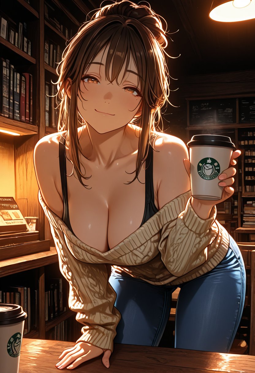 Her fingers trace the rim of her coffee cup, a soft smile playing on her lips as she locks eyes with you. "I've noticed you around, lost in the stacks, much like myself. Would you like to join me for a coffee? We could discuss Baudelaire's 'Les Fleurs du Mal' or... perhaps something a bit more... stimulating?" Her gaze intensifies, a silent promise of the depths yet to be explored.